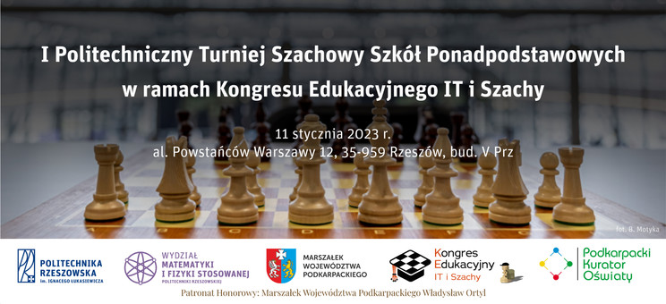 Już niebawem, 11.01.2023 r., Politechnika Rzeszowska będzie miejscem rozgrywania I Politechnicznego Turnieju Szachowego Szkół Ponadpodstawowych. Organizatorami tego wydarzenia będzie Politechnika Rzeszowska oraz Fundacja Edukacyjna IT i Szachy przy wsparciu Podkarpackiego Kuratora Oświaty w Rzeszowie.